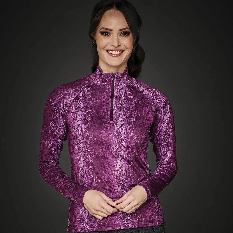 Functional, full stretch tech top in an all over print. Features soft brushed inside, quick – drying fabric and high collar with 1/3 front zipper and lock zipper pull.