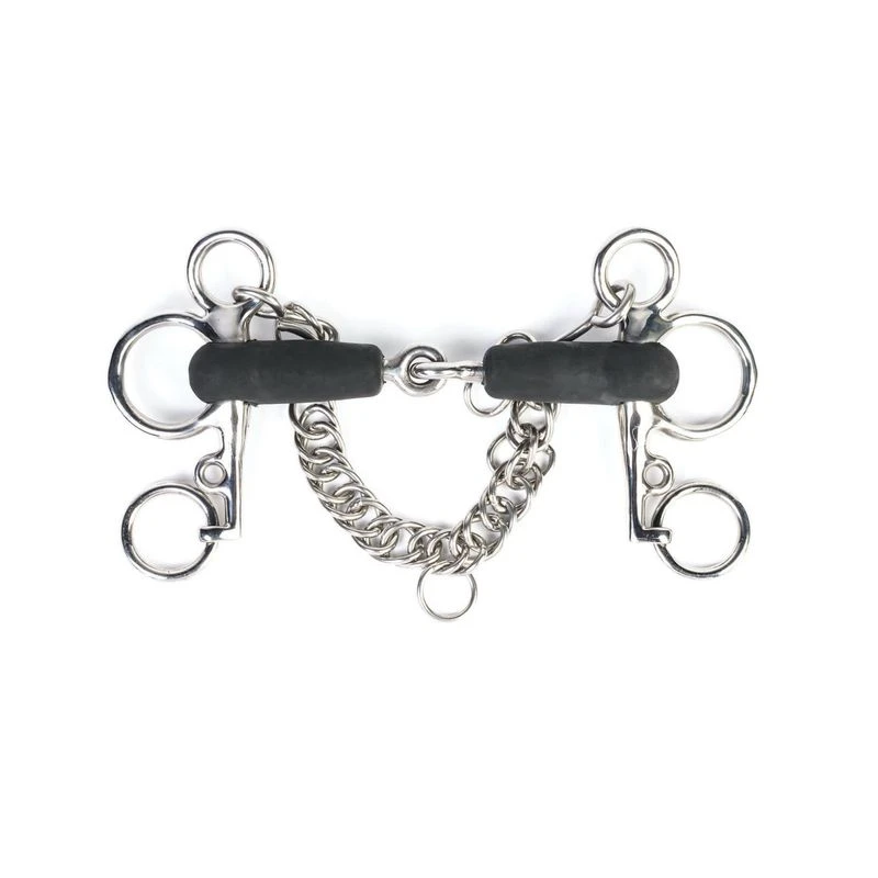 This bit features Pelham cheeks and a single joint rubber mouth.