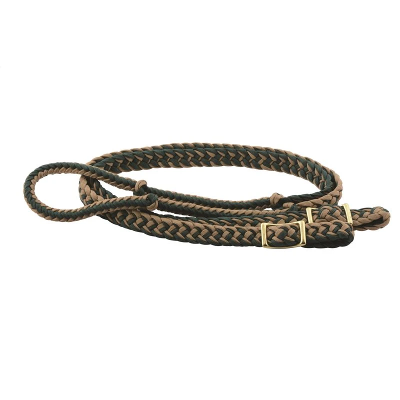 Durable and featuring an array of colours, you can now match your reins to your tack. 1″x 7 1/2′. Flat braided poly with a round braided centre hand hold. Brass conway buckles at bit ends.